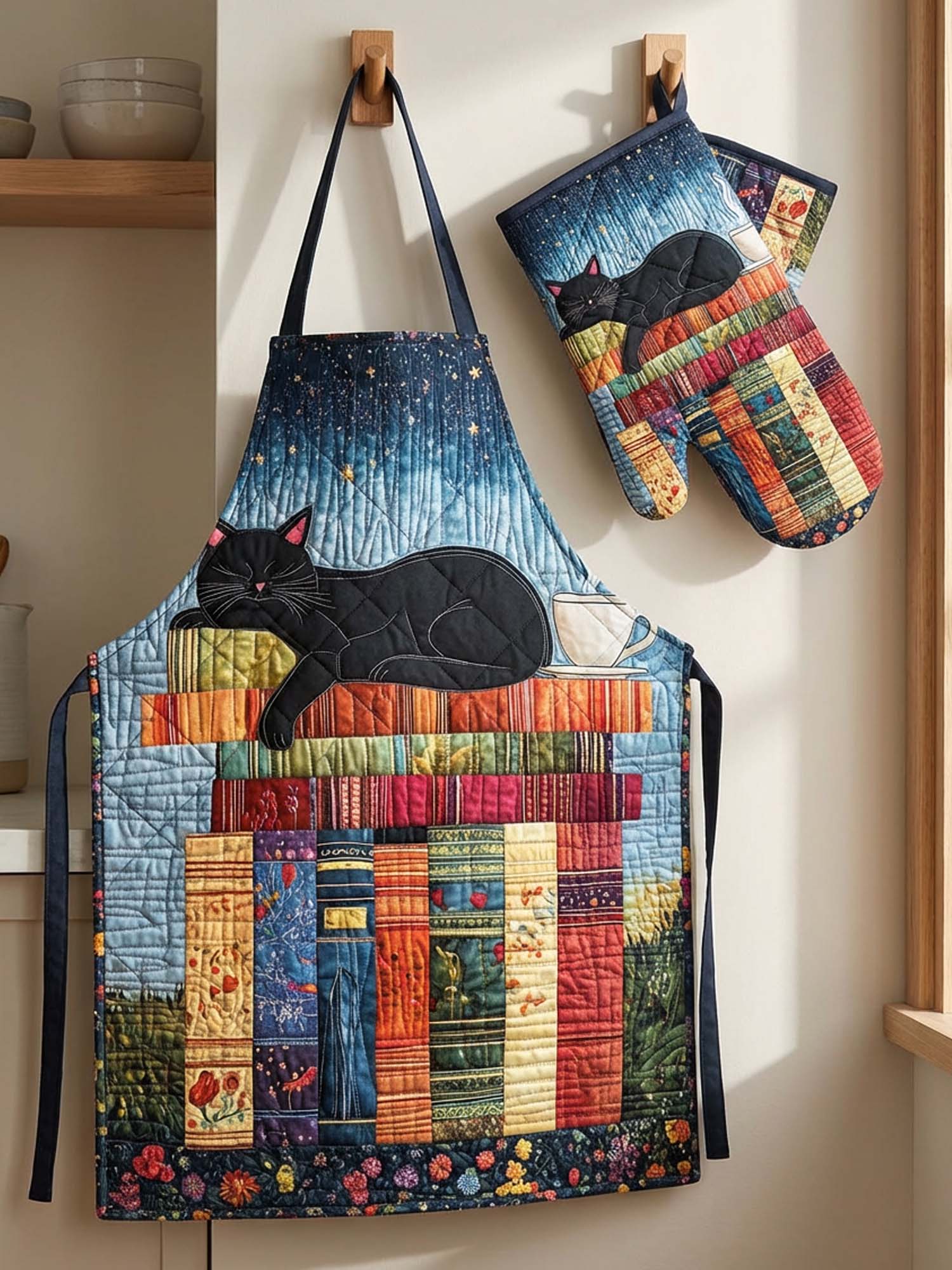Book And Cat Quilted Apron Set (2-Piece) – Padded Apron + Heat-Resistant Oven Mitts