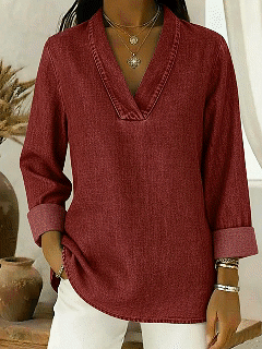 - The V-neck edge features matching decorative stitching, reinforcing the neckline's silhouette, flattering the shoulder and neck proportions, and adding a touch of refined detail.